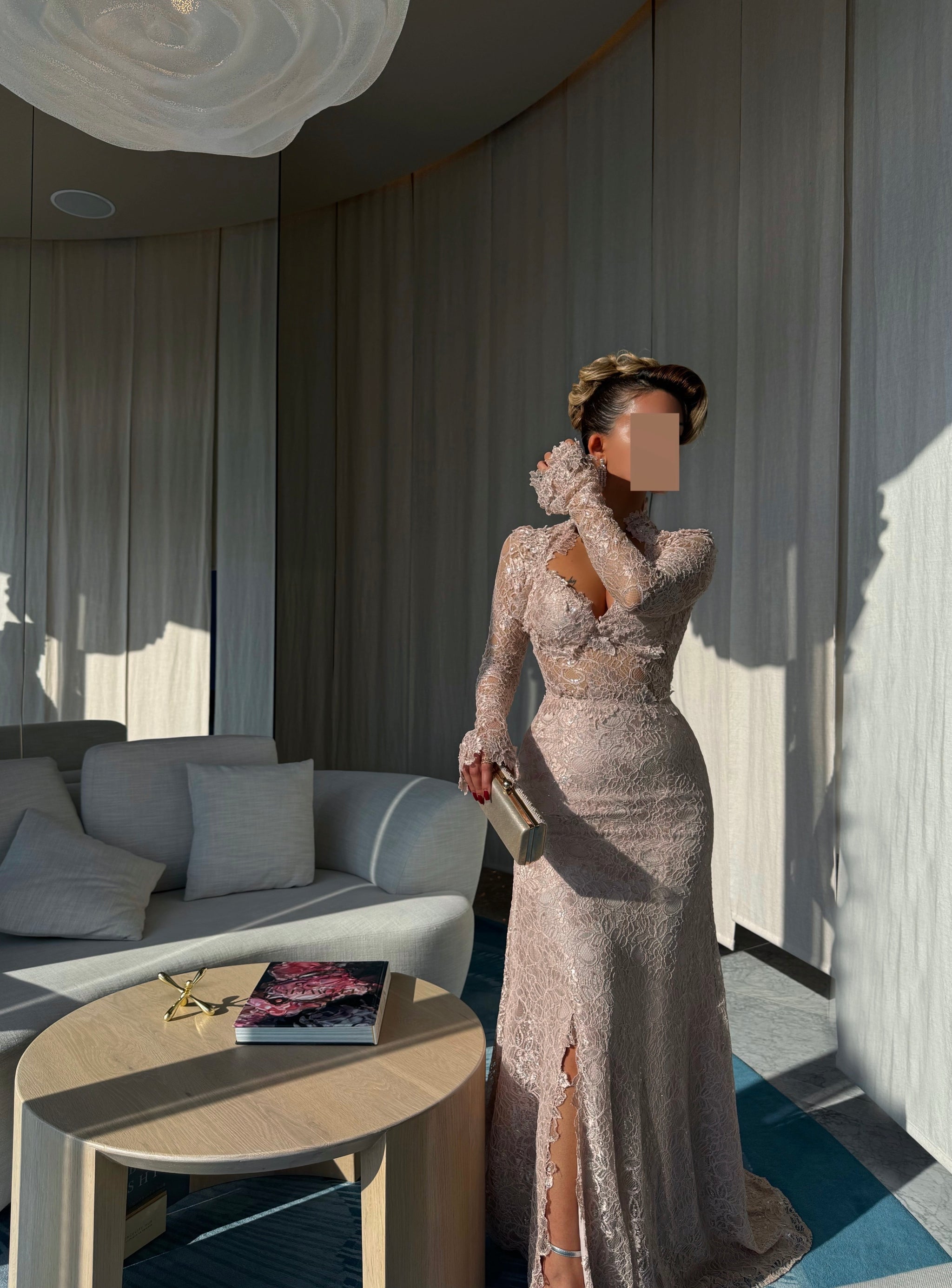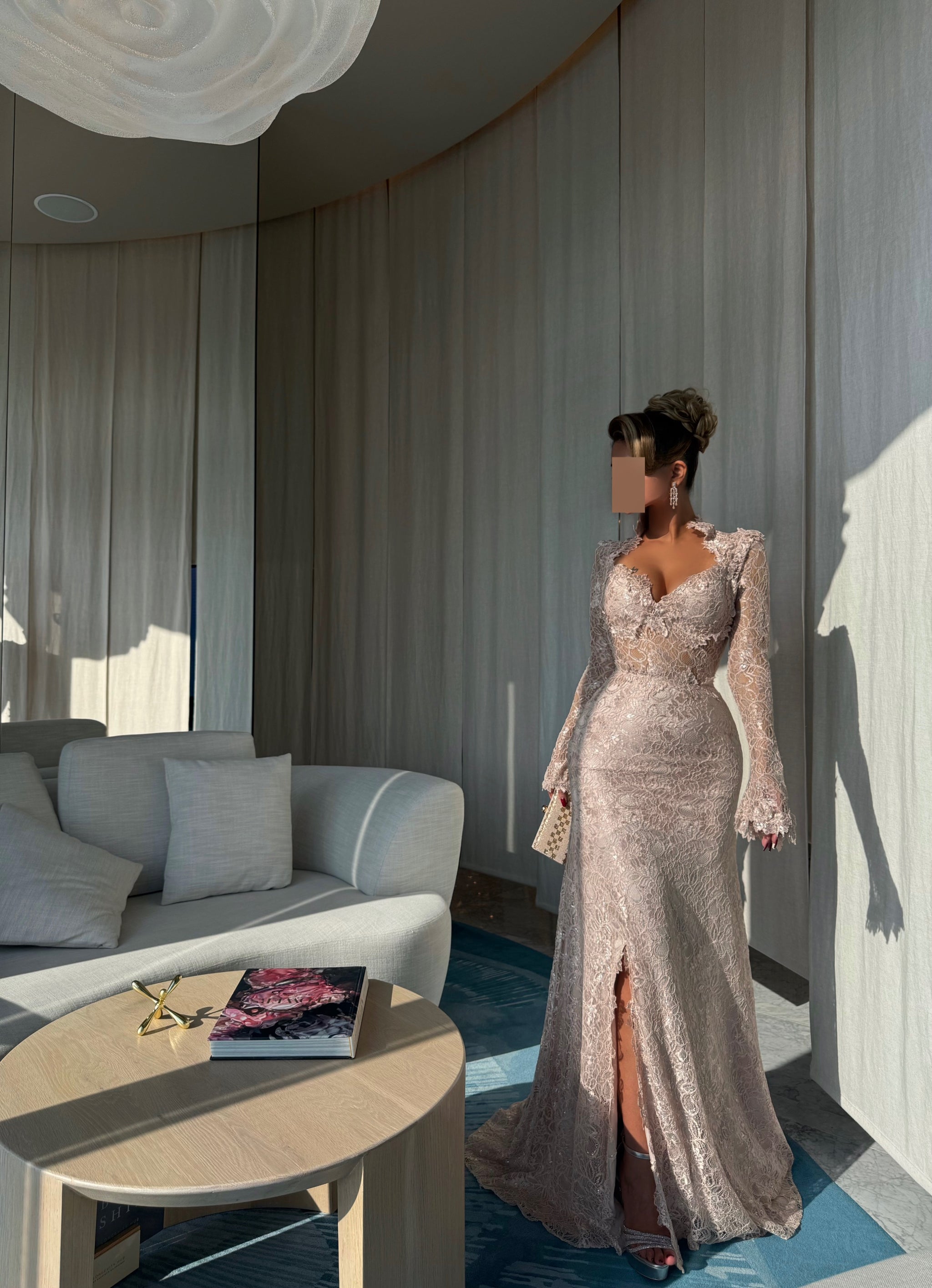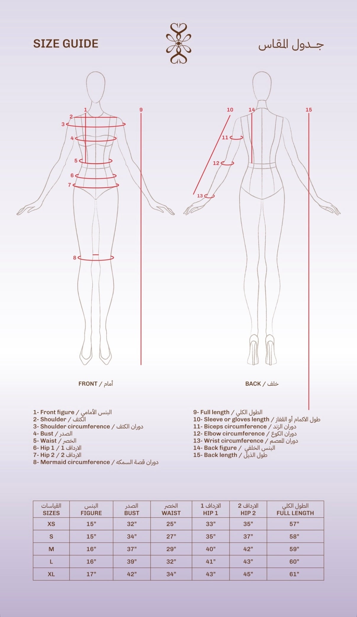 يجب أن يتم قياس الطول من الكتف حتى الأرضية وأنت ترتدين الكعب الذي ترغبين في ارتدائه مع الفستان.