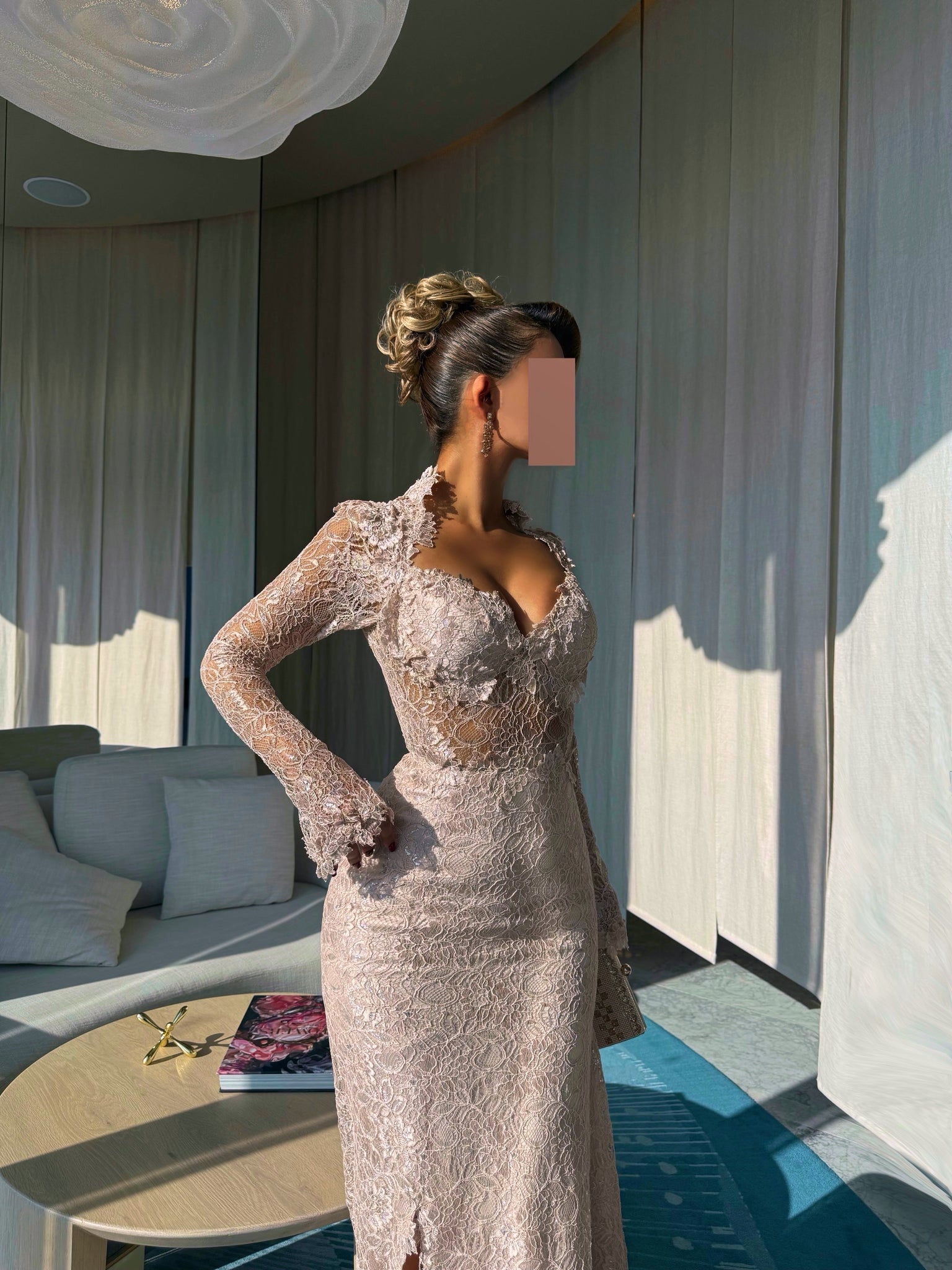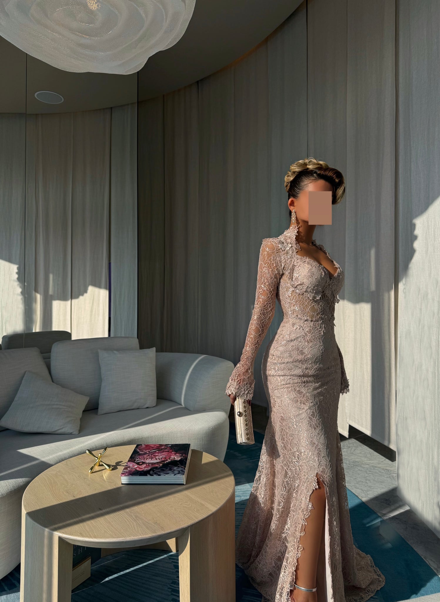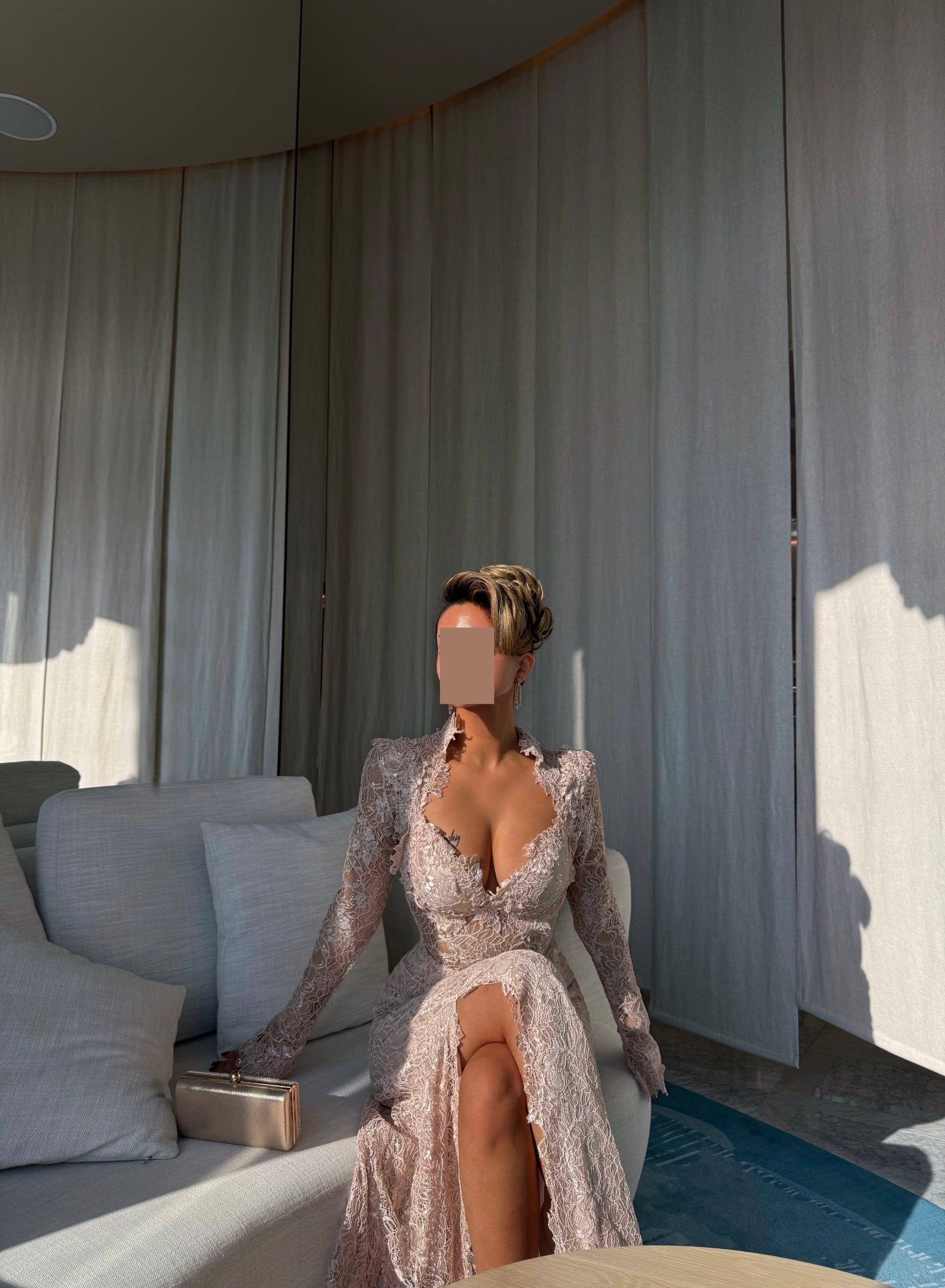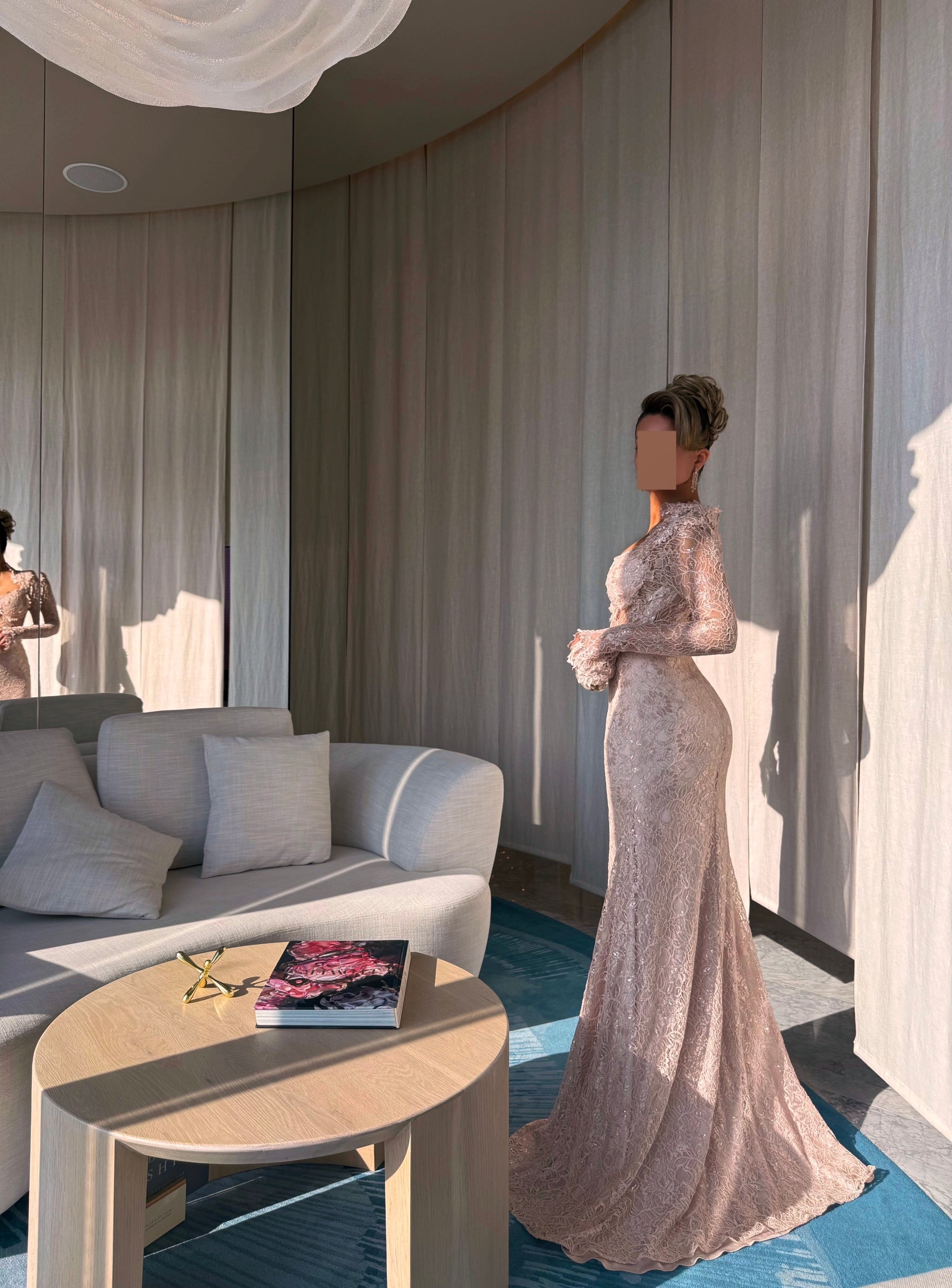 يجب أن يتم قياس الطول من الكتف حتى الأرضية وأنت ترتدين الكعب الذي ترغبين في ارتدائه مع الفستان.